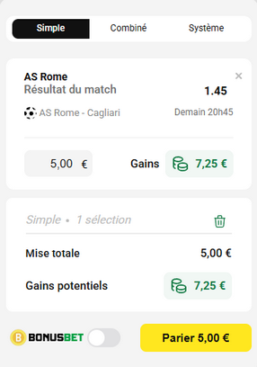 ➡️ Ici nous pronostiquons la victoire de l'AS Rome qui fait partie du Top 3 du championnat de Serie A et joue à domicile contre Cagliari, une équipe plus loin au classement. De plus la cote est intéressante.